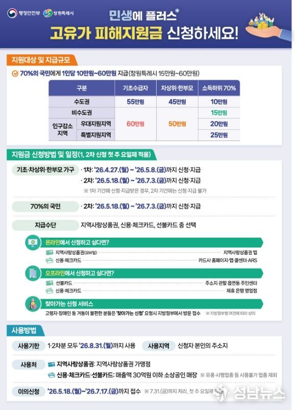 한편, 오는 5월 18일부터 7월 3일까지는 1차 지급대상을 제외한 소득 하위 70% 시민을 대상으로 2차 지원금의 신청·지급이 이어진다. 건강보험료를 활용한 세부 선정 기준(컷오프) 등 구체적인 사항은 5월 중 행정안전부의 별도 지침이 마련되는 대로 확정·안내할 예정이다.