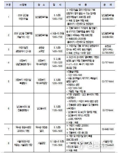 서울역사박물관 어린이박물관에서는 '한양에서 놀자!'(5.5.) 행사를 통해 공방·체험 프로그램 등이 진행되며, 경희궁에서는 독서 프로그램 '책 읽으라궁' (5.5., 5.10.)이 진행된다. 어린이 대상의 체험형 기획전시도 운영되고 있다.