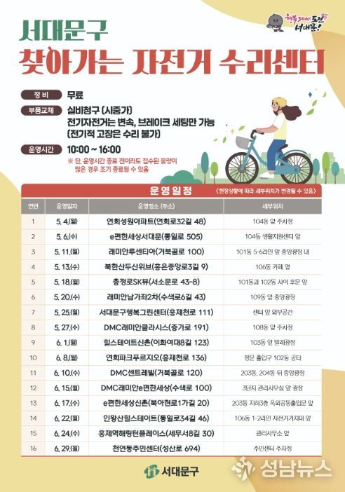 서대문구가 주민들의 자전거 이용 활성화와 안전한 운행을 위해 5∼6월과 9∼11월 ‘찾아가는 자전거 수리센터’를 총 32회 운영한다.