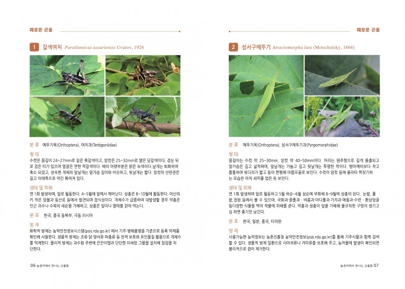 도감은 해충, 이로운 곤충, 자연 속 곤충으로 구분해 구성됐다. 각 종마다 형태와 생태, 분포 특성, 역할은 물로 방제 방법도 함께 제시해 농업 현장의 의사결정에 바로 적용할 수 있도록 했다.