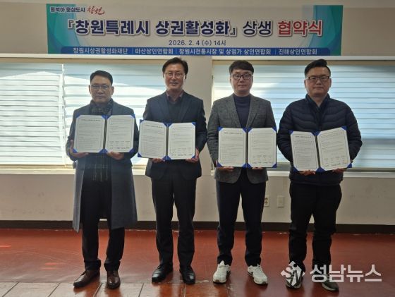 성남뉴스 관리자 기자 | 창원시상권활성화재단(이사장 장금용)은 2월 4일 오후 2시, 창원시상권활성화재단 어울림센터에서 마산통합상인연합회, 창원시 전통시장 및 상점가 상인연합회, 진해상인연합회(대표시장: 진해중앙시장)와 '창원특례시 상권활성화'를 위한 상생 업무협약을 체결했다.