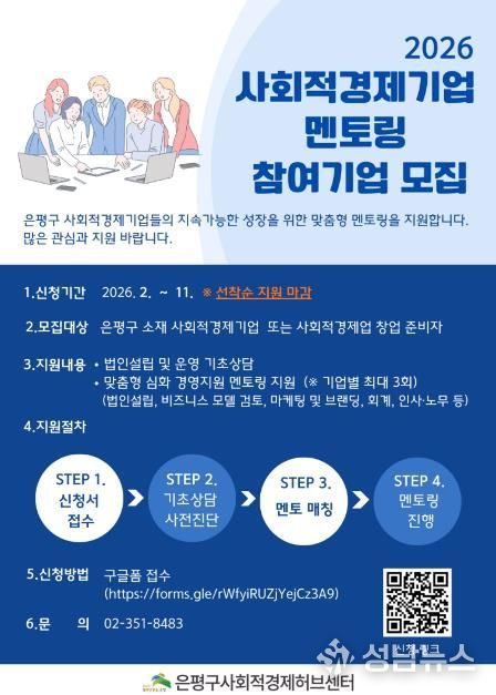 성남뉴스 관리자 기자 | 서울 은평구는 관내 사회적경제기업의 경영 역량 강화를 위해 ‘2026년 사회적경제기업 맞춤형 멘토링 사업’을 운영하고, 참여 기업을 모집한다고 밝혔다.