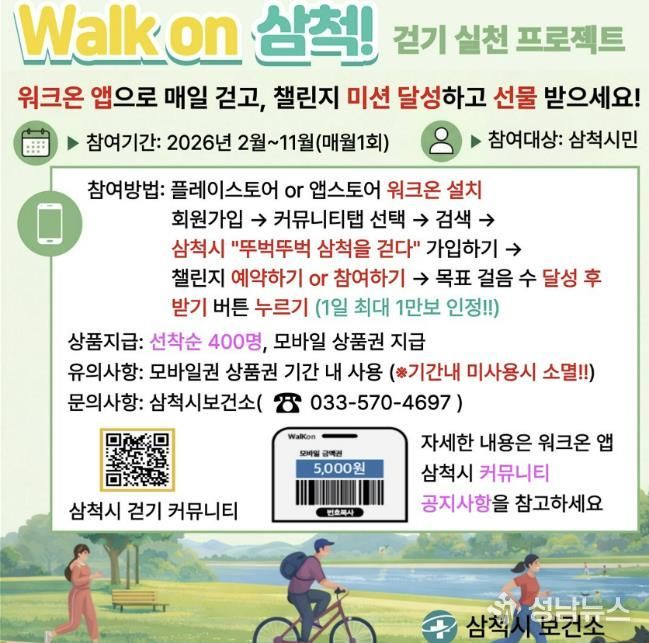 성남뉴스 관리자 기자 | 삼척시는 시민들의 건강 증진과 일상 속 걷기 실천율 향상을 위해 모바일 걷기 앱 '워크온(Walk On)'을 활용한 ‘워크온 걷기 챌린지’를 오는 2월부터 11월까지 운영한다.