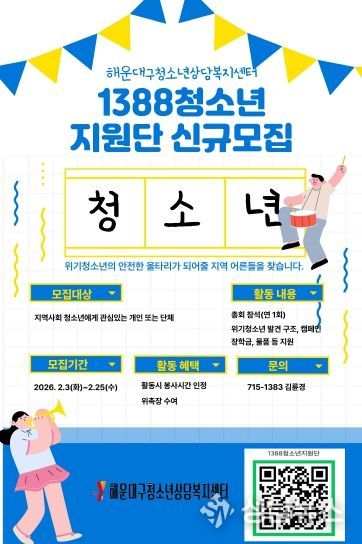 성남뉴스 관리자 기자 | 해운대구 청소년상담복지센터는 지역 내 위기청소년들을 조기에 발견하고 든든한 울타리가 되어줄 ‘1388청소년지원단’을 이달 25일까지 공개 모집한다고 밝혔다.