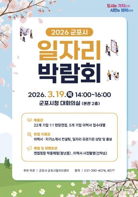 성남뉴스 관리자 기자 | 군포시는 오는 3월 19일 오후 2시부터 시청 대회의실에서 ‘2026년 군포시 일자리 박람회’를 개최함에 따라 2월 10일부터 2월 27일까지 박람회에 참여할 기업체를 모집한다.