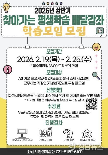 성남뉴스 관리자 기자 | 화성특례시는 2월 19일부터 2월 25일까지 2026년 상반기'찾아가는 평생학습 배달강좌'학습모임을 모집한다.
