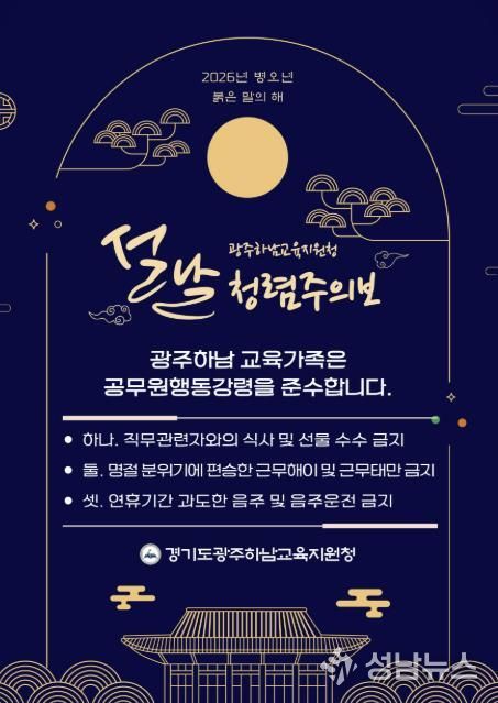 성남뉴스 관리자 기자 | 경기도광주하남교육지원청은 2월 9일, 2026년 병오년 설명절을 맞아 관내 교직원들이 청렴한 마음가짐으로 새해를 시작할 수 있도록‘교육장 청렴서한문’과‘청렴주의보’를 각급 학교에 전달했다.