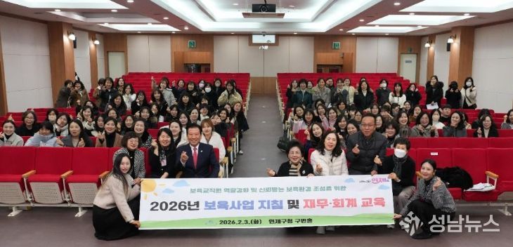 성남뉴스 관리자 기자 | 연제구는 지난 2월 3일 연제구청 구민홀에서 관내 어린이집 원장 및 보육교사 120여 명을 대상으로 ‘2026년 보육사업 지침 개정사항 및 재무·회계 교육’을 실시했다.