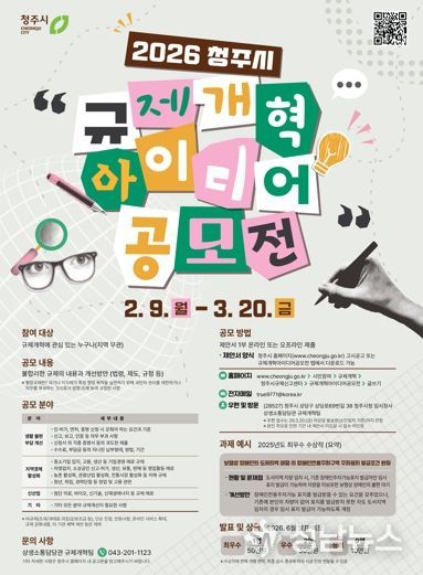 성남뉴스 관리자 기자 | 청주시는 시민이 체감할 수 있는 다양하고 창의적인 규제개혁 아이디어를 발굴해 일상생활과 경제활동을 제약하는 규제를 적극 개선하고자 ‘2026 청주시 규제개혁 아이디어 공모전’을 개최한다고 8일 밝혔다.