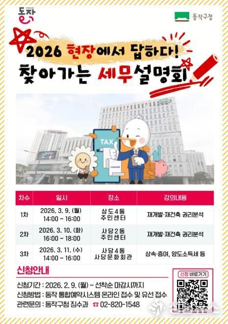 성남뉴스 관리자 기자 | 동작구가 재개발·재건축이 활발히 진행되는 구 특성을 반영해 ‘2026 현장에서 답하다! 찾아가는 세무설명회’를 개최한다고 밝혔다.