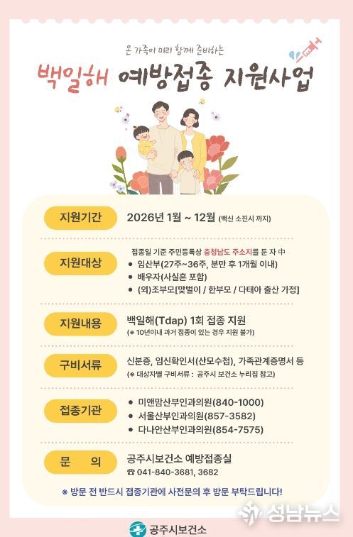 (성남뉴스) 공주시는 올해 백일해 예방접종 지원을 확대 운영한다고 9일 밝혔다.