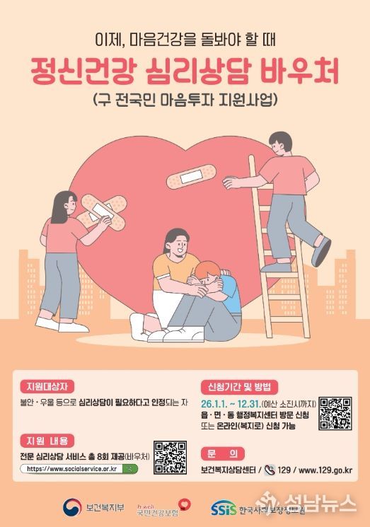 (성남뉴스) 공주시는 시민들의 마음건강을 돌보고 정서적 어려움을 조기에 발견해 대응하기 위해 전문 심리상담 서비스를 제공하는 ‘정신건강 심리상담 바우처사업’을 2026년에도 본격 추진한다고 밝혔다.