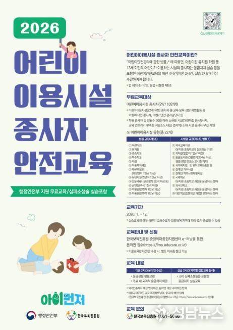 (성남뉴스) 원주시는 행정안전부가 주관하는 ‘2026년 어린이 이용시설 종사자 안전교육’을 실시한다.