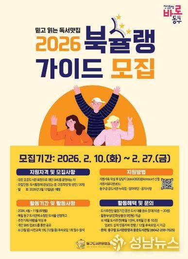 (성남뉴스) 대전 동구는 책을 사랑하고 글쓰기에 관심 있는 구민을 대상으로, 2026년 동구 도서추천단 ‘북슐랭 가이드’를 모집한다고 10일 밝혔다.