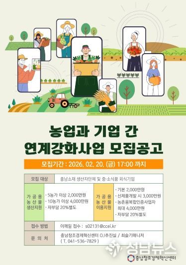(성남뉴스) (재)충남창조경제혁신센터는 ‘2026년 농업과 기업 간 연계강화 지원사업’ 참여 대상을 모집한다고 밝혔다.