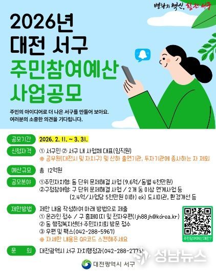 (성남뉴스) 대전 서구는 이달 11일부터 다음 달 31일까지 주민참여예산 공모사업에 관한 주민들의 제안을 받는다.