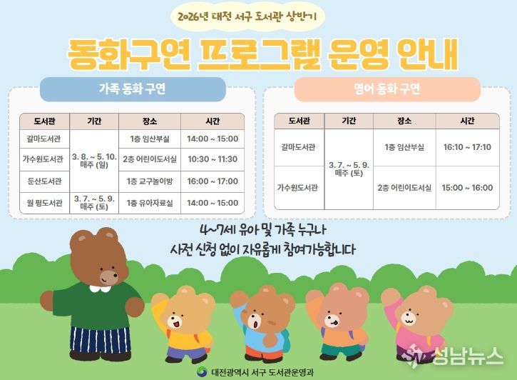 (성남뉴스) 대전 서구 4개 공공도서관(갈마ㆍ가수원ㆍ둔산ㆍ월평)은 주말 온 가족이 함께 즐길 수 있는 가족 동화구연 및 영어 동화구연 프로그램을 운영한다.