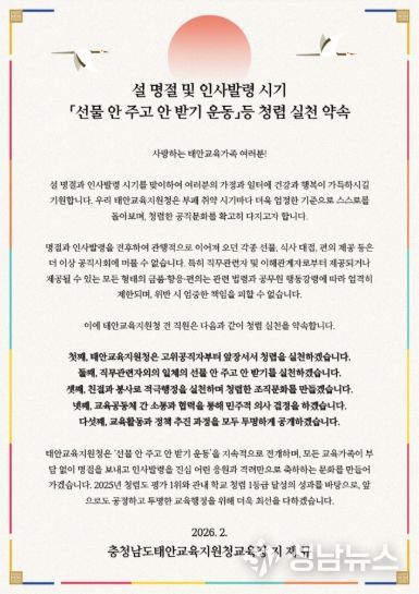 (성남뉴스) 충청남도태안교육지원청은 설 명절과 인사발령 시기를 맞아 전 직원을 대상으로 청렴한 공직문화 확립을 다짐하는 청렴서한문을 발표했다.