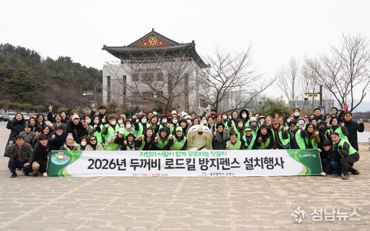 (성남뉴스) 대구 수성구는 지난 10일 전국 최대 두꺼비 집단 산란지인 욱수동 망월지 일대에서 ‘두꺼비 로드킬 방지 펜스 설치’ 행사를 실시했다.