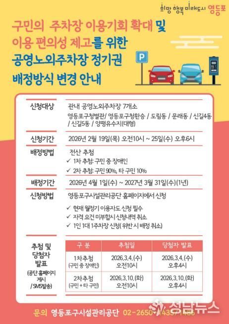 (성남뉴스) 영등포구가 관내 공영노외주차장 7개소에 대한 정기권 신청을 ‘선착순 순환배정제’에서 ‘구민 우선 전산추첨 순환배정제’로 변경해 오는 19일부터 25일까지 접수한다고 밝혔다.