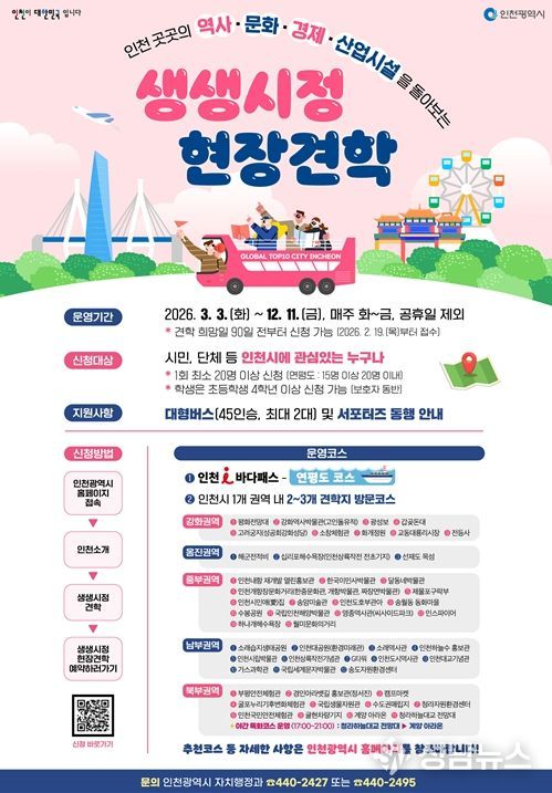 (성남뉴스) 인천광역시가 인천의 주요 사업 현장과 문화·환경 시설을 직접 방문하는 ‘2026년 생생시정 현장견학’을 오는 3월 3일부터 본격 시작한다.