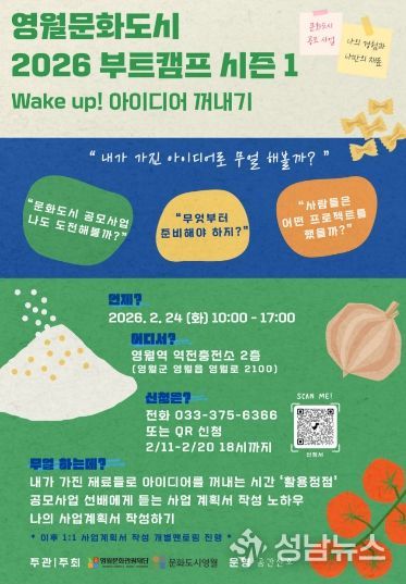 (성남뉴스) (재)영월문화관광재단 문화도시센터는 오는 2월 24일 영월역 문화충전소에서 지역민의 창의적인 로컬 아이디어를 발굴하고 실질적인 사업계획서로 발전시키기 위한 ‘영월 로컬 아이디어 구체화 부트캠프 시즌 1’을 개최한다.
