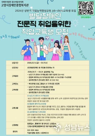 (성남뉴스) 고양시장애인종합복지관은 성인 발달장애인의 전문직 취업을 위한 직업능력향상교육 ‘잡클릭스(job-clicks)’ 상반기 교육생을 모집한다고 밝혔다.