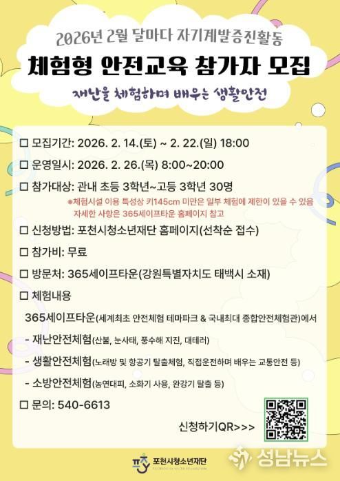 (성남뉴스) 포천시청소년재단은 오는 22일까지 체험형 안전 활동을 주제로 한 ‘달마다 자기계발 증진활동’ 2월 프로그램 참가자를 모집한다.