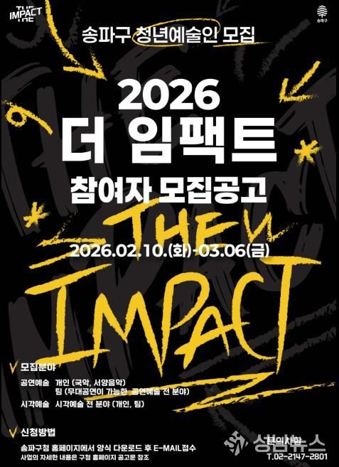 (성남뉴스) 서울 송파구는 재능 있는 청년예술인을 발굴·지원하는 ‘2026 더 임팩트’ 참가자를 오는 3월 6일 오후 5시까지 모집 중이라고 23일 밝혔다. 이번 공모는 지난 2월 10일부터 접수가 진행되고 있다.
