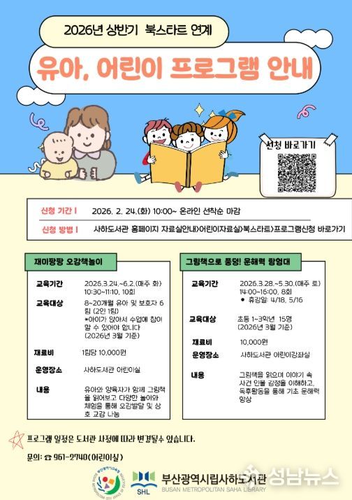 (성남뉴스) 부산시교육청 사하도서관은 3월부터 6월, 9월부터 11월 상·하반기에 걸쳐 영유아와 보호자, 초등 저학년을 대상으로 ‘북스타트 연계 프로그램’을 운영한다.