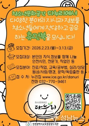 (성남뉴스) 인천광역시교육청중앙도서관청소년문화공간 다누리는 2월 23일부터 3월 13일까지, 재능공유 플랫폼인 사람책 도서관 ‘휴먼 라이브러리’를 함께 이끌어갈 ‘휴먼북(사람책)’을 모집한다.
