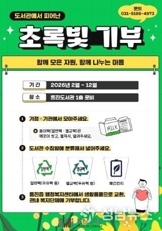 (성남뉴스) 김포시 통진도서관은 2월부터 12월까지 시민들과 함께 환경을 보호하고 소외된 이웃을 돕는 자원순환 나눔 프로그램 ‘도서관에서 피어난 초록빛 기부’를 운영한다고 밝혔다.