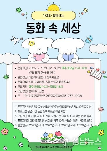 (성남뉴스) 원주교육문화관은 유아들이 책과 자연스럽게 친해지고, 가정 내 독서 문화를 형성할 수 있도록 유아와 가족을 대상으로 한 독서프로그램 가족과 함께하는 ‘동화 속 세상’을 운영한다.