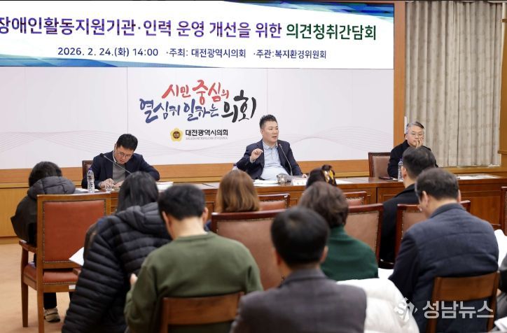 (성남뉴스) 대전광역시의회 복지환경위원회는 24일 시의회 3층 소통실에서 황경아 의원(국민의힘, 비례대표) 주재로 '장애인활동지원기관·인력 운영 개선을 위한 의견청취 간담회'를 개최했다.