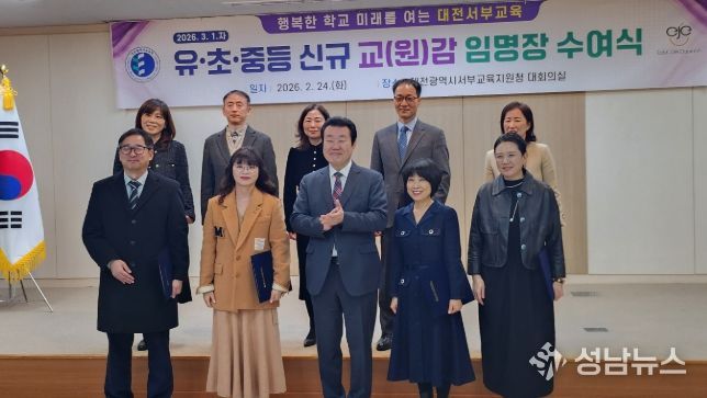(성남뉴스) 대전동부교육지원청과 대전서부교육지원청은 2월 24일, 오는 2026년 3월 1일자 인사발령에 따라 승진 및 전직 임용되는 유·초·중등 신규 교(원)감 임명장 및 인사발령통지서 수여식을 개최했다고 밝혔다.