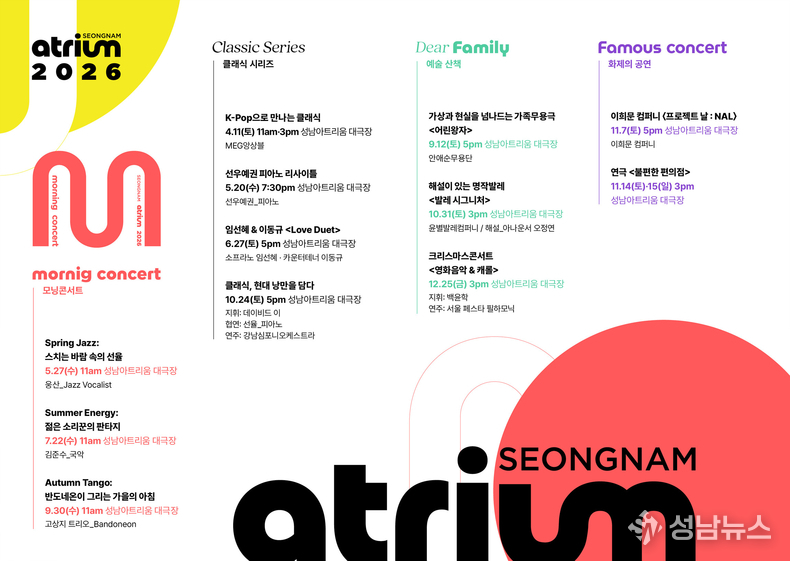성남문화재단(대표이사 윤정국)은 개관 5년 차를 맞는 성남아트리움의 2026년 공연 라인업을 공개했다. 매년 클래식 거장들의 리사이틀과 실내악, 오케스트라 등 정통 클래식 프로그램으로 사랑받아 온 성남아트리움은 올해 K-팝, 탱고, 재즈 등을 결합한 새로운 클래식 무대부터 평일 오전에 즐기는 예술 산책, 장르를 넘나드는 무대까지 다채로운 공연으로 관객들을 만난다.