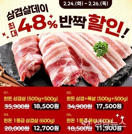 이어 2월 24일부터 26일까지는 ‘삼겹살데이 맞이 반짝 할인전’이 열린다. 온충북에 입점한 고품질 한돈 삼겹살과 목살을 특별 할인가에 선보이며, 고기와 함께 곁을여 먹기 좋은 버섯, 상추 등 쌈채소류도 동시에 할인 판매해 소비자들이 한 번에 다양한 상품을 편리하게 구매할 수 있도록 기획했다.
