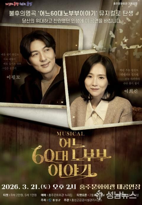 (성남뉴스) 홍성군 홍주문화회관은 내달 21일 오후 2시, 중장년층을 넘어 모든 세대가 공감할 수 있는 따뜻한 가족 이야기를 그려낸 뮤지컬 ‘어느 60대 노부부 이야기’를 무대에 올린다.