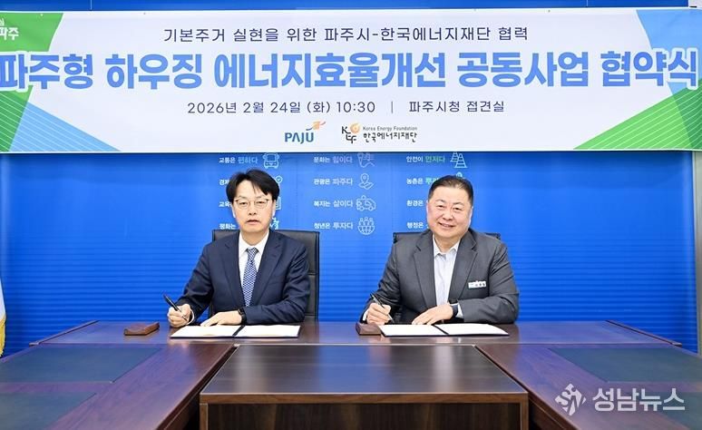 (성남뉴스) 파주시는 지난 24일 한국에너지재단과 ‘기본주거 실현을 위한 파주형 하우징 에너지효율개선 공동사업’업무협약을 체결했다.