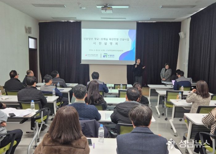 (성남뉴스) 경기도수원교육지원청은 신분당선 광교–호매실 복선전철 공사 추진에 앞서 2월 25일 국가철도공단과 함께 공사 구간 100m 이내에 위치한 5개 인접학교를 대상으로 사전설명회를 실시했다고 밝혔다.