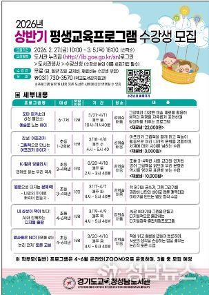 (성남뉴스) 경기도교육청성남도서관이 학생, 학부모, 다문화 청소년 및 어르신을 대상으로‘2026년 상반기 평생교육 프로그램’을 운영한다.