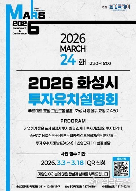 (성남뉴스) 화성특례시가 오는 3월 24일 푸르미르 호텔에서 ‘2026 화성특례시 투자유치 설명회’를 개최하고, 3월 3일부터 3월 18일까지 QR코드를 통한 사전접수를 진행한다.