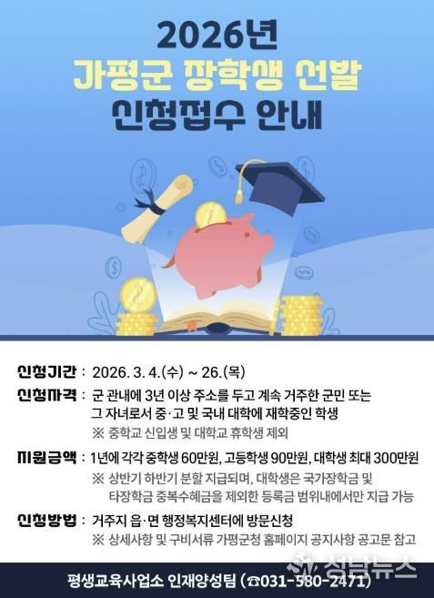 (성남뉴스) 가평군이 지역 학생들의 균등한 교육 기회를 보장하고 우수 인재를 육성하기 위해 2026년도 장학생 선발에 나선다.