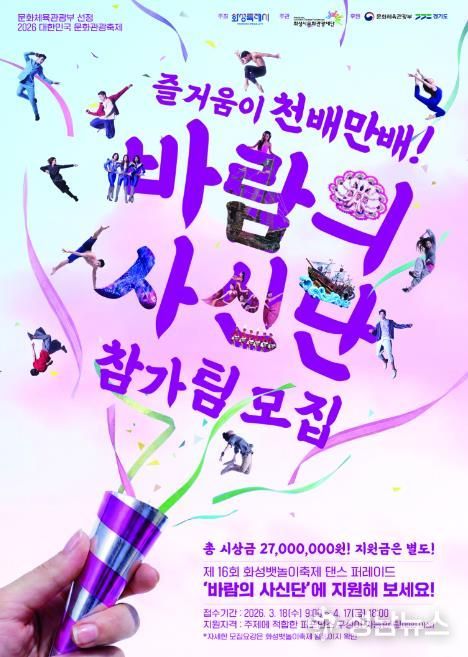 (성남뉴스) (재)화성시문화관광재단은 제16회 화성 뱃놀이 축제의 주인공이 될 ‘바람의 사신단 댄스 퍼레이드‘경연 참가팀을 모집한다.