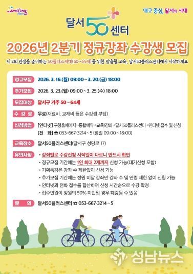 (성남뉴스) 대구 달서구는 50플러스세대의 역량 강화와 자기계발을 지원하기 위해‘2026년 2분기 달서50플러스센터 정규강좌’수강생을 3월 16일부터 25일까지 선착순 모집한다.