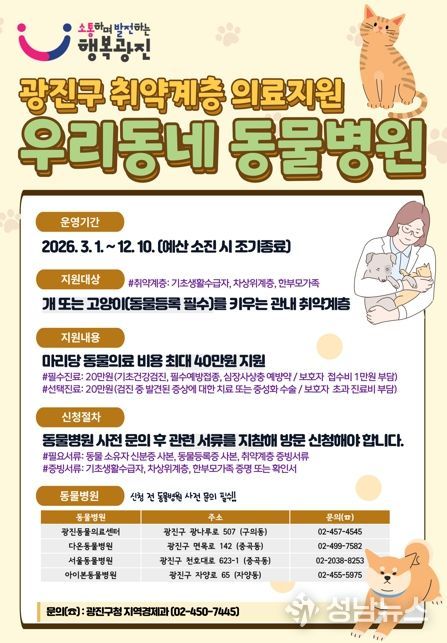 (성남뉴스) 광진구가 경제적 어려움으로 반려동물 진료를 받기 어려운 취약계층을 위해 ‘우리동네 동물병원’을 운영한다. ‘우리동네 펫위탁소’와 함께 취약계층 반려동물을 지원하기 위한 동물 복지 정책이다.