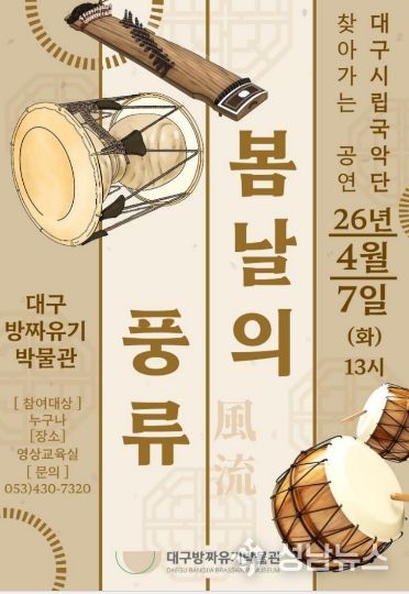 (성남뉴스) 대구문화예술진흥원 박물관운영본부 소속 대구방짜유기박물관은 봄날에 팔공산 역사문화 특강과 국악 공연을 기획해 3월 24일 오후 2시에 ‘탁본자료로 만나는 팔공산 역사문화 깊이’를, 4월 7일 오후 1시에 대구시립국악단 찾아가는 공연 ‘봄날의 풍류’를 개최한다.