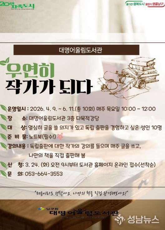 (성남뉴스) 대구 남구는 지역주민에게 직접 도서를 출판해 보는 경험을 제공하고자 도서 독립출판 프로그램 '우연히 작가가 되다'를 운영한다고 밝혔다.
