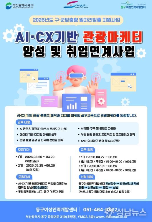 (성남뉴스) 부산 동구와 서구가 협력하여 추진한 ‘AI·CX 기반 관광마케터 양성 및 취업 연계 사업’이 지난 3월 6일 부산시 구·군 맞춤형 일자리 창출 추진 공모사업에 최종 선정됐다.