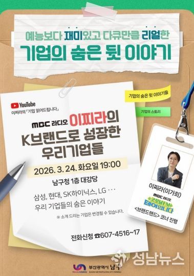 (성남뉴스) 부산 남구는 3월 24일 화요일 오후 7시, 남구청 1층 대강당에서‘남구열린대학 특강’을 개최한다고 밝혔다. 강연은 MBC라디오 ⌜굿모닝FM테이입니다⌟ 브랜드랜드 코너에서 기업 이야기를 재치 있고 알기 쉽게 전달하는 이찌라(본명 이가희)가 진행한다.